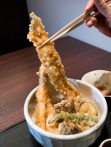 穴子は器に収まるように切って出されることが多いですが、長いまま登場する驚きの品。丼タレは、出汁醤油と天かす、砂糖を煮込んだお店の特製。天かすのエキスが加わり、出汁の効いた上品な味わいです。