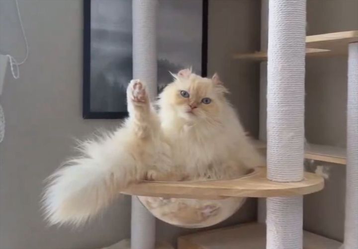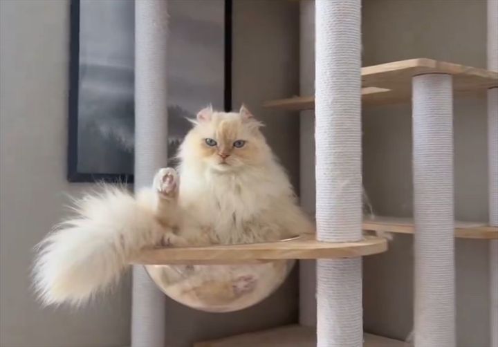 キャットタワーのボウルハンモックに入って毛づくろいをしていたネコ。 キレイに仕上げてリラックスしているようなのですが・・・、足をおろすのをすっかり忘れているみたい!! その姿に反響の声が寄せられています。