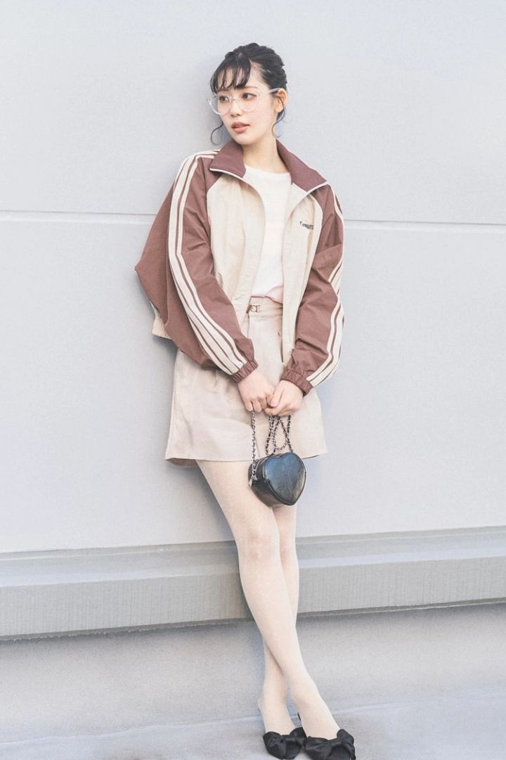ショートパンツは着回し。 トラックジャケット  7,700円/RODEO CROWNS(バロックジャパンリミテッド)  ピンクロンT 3,289円/ROPÉ PICNIC(ジュン) メガネ 880円/パリスキッズ 原宿店 バッグ 4,700円、ミュール 7,900円/ともにMORE self LOVE タイツ 1,100円/靴下屋(Tabio)