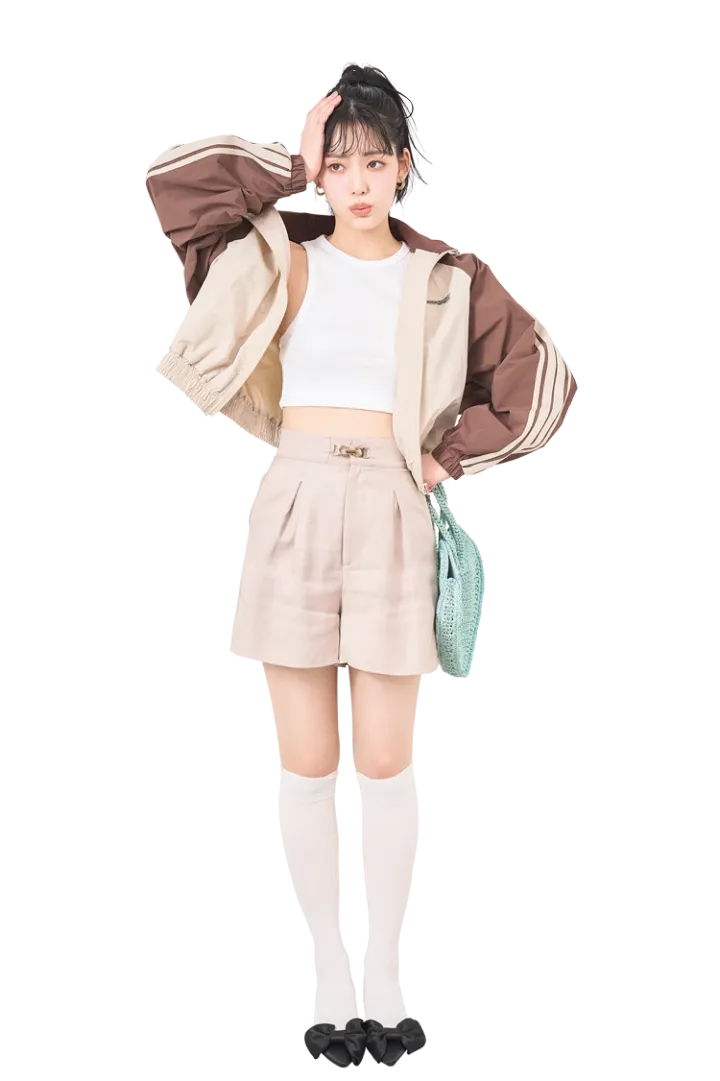 ショートパンツは着回し。トラックジャケット  7,700円/RODEO CROWNS(バロックジャパンリミテッド) クロップド丈タンクトップ 1,090円/ZARA(ザラ) イヤリング 4,620円/ミミサンジュウサン(サンポークリエイト)バッグ 7,700円/キャセリーニ ソックス 1,540円/靴下屋(Tabio) ミュール 7,900円/MORE self LOVE