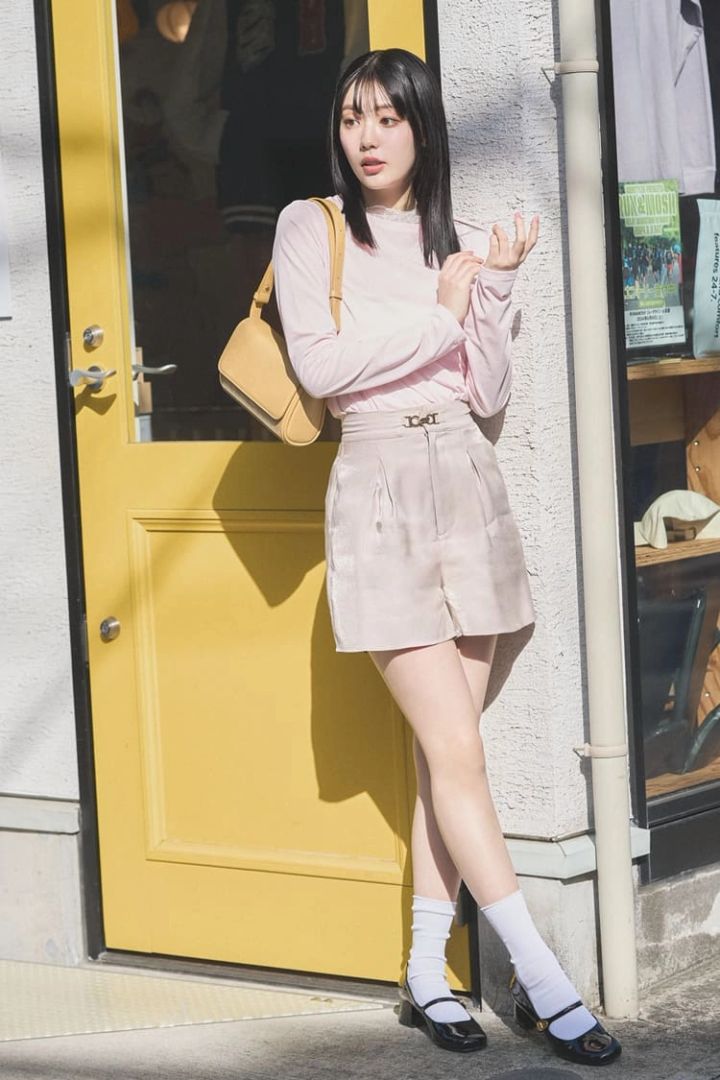 ショートパンツは着回し。ピンクロンT 3,289円/ROPÉ PICNIC(ジュン) リボン柄シアートップス 2,199円/PHILLY バッグ 14,228円/STAND OIL(MUSINSA GLOBAL STORE) ソックス 990円/靴下屋(Tabio) パンプス 9,500円/チャールズ&キース(チャールズ&キース ジャパン)