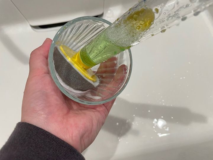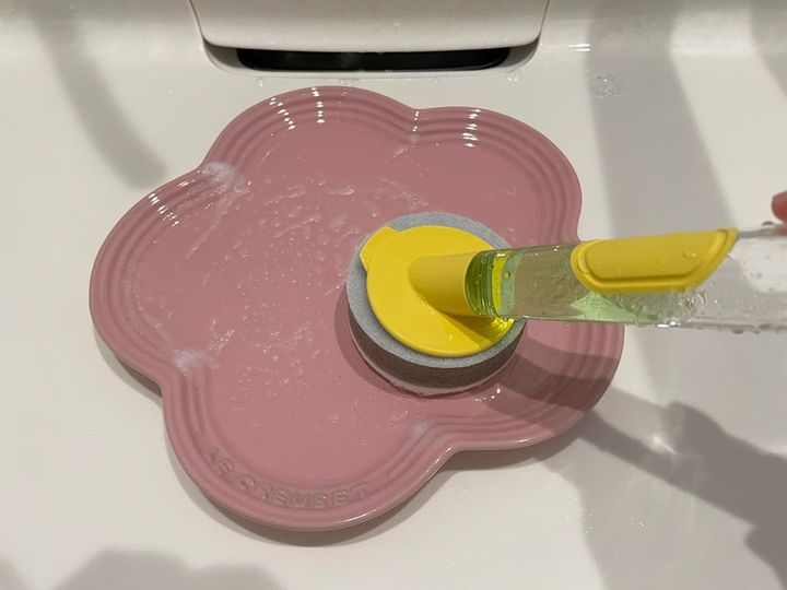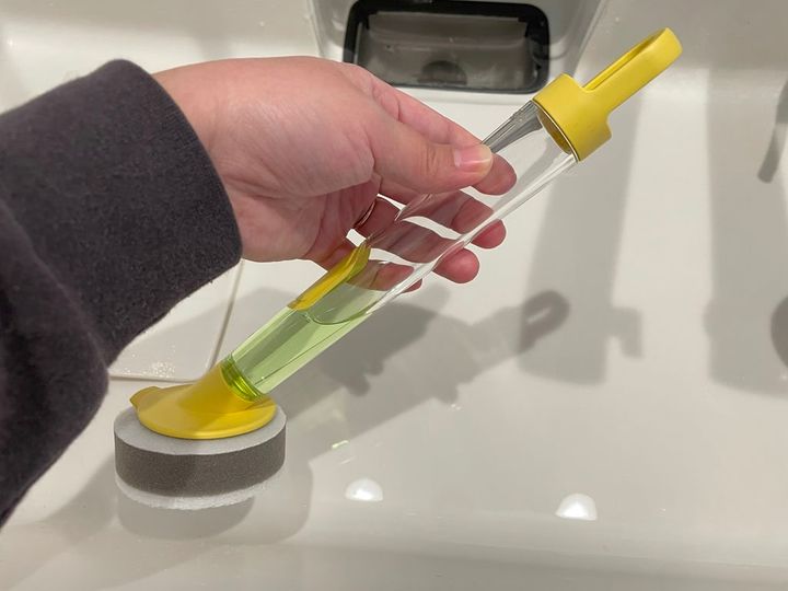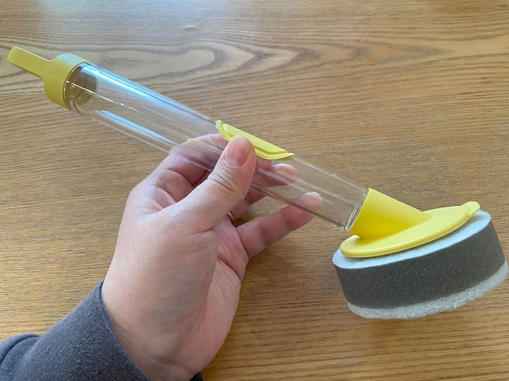 ボタンを押すと洗剤が出てくるため、途中で洗剤をつける必要がなく、スポンジを直接持たずに食器洗いができます。