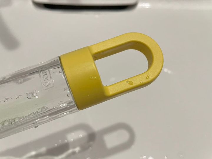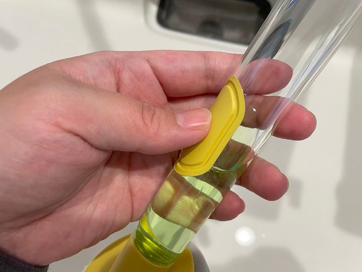 黄色い細長いボタンを押すと、洗剤がスポンジに流れ出てくる仕組みです。