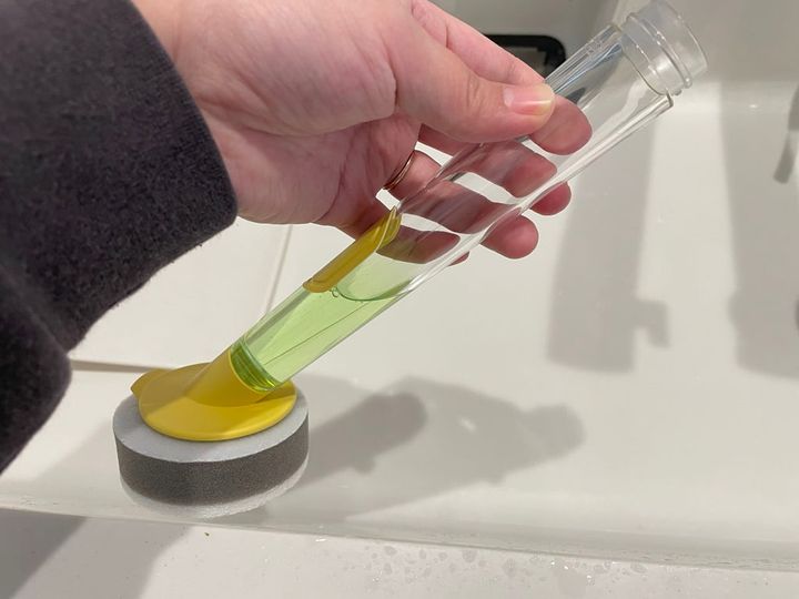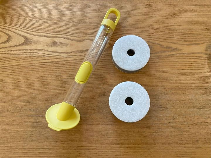 いつも洗い物をするときは、スポンジを水で濡らし、洗剤をつけて泡立ててからお皿をゴシゴシ擦りますが、こちらは、お皿を少し濡らしておいて、スポンジの洗剤が出るボタンをお皿の上で押します。