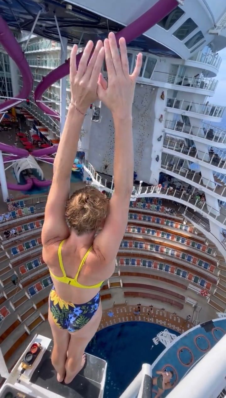 プールにダイブしようと飛び込み台に立つ女性。 その飛び込み台は・・・、なんと豪華客船のとんでもなく高い場所にあったのです!!
