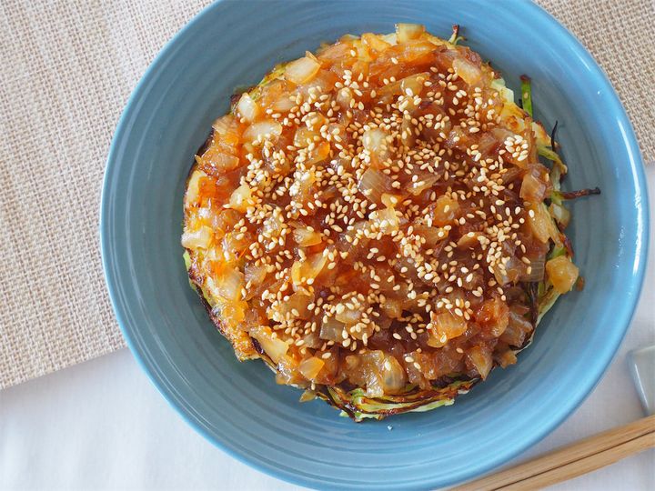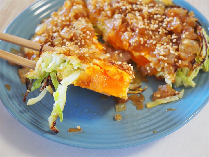 一見、目玉焼きとわからなくなるくらいにたっぷりとかかった玉ねぎソース。シャキシャキと食感の残る甘じょっぱい玉ねぎのコクのある旨味がたまらないおいしさ!焼いたお肉にかけたり、焼き野菜にかけても合いそうです。ソースを食べただけでも、リピートを確信しました。目玉焼きを真ん中で切ってみると、とろり半熟の黄身。焼いた卵の香ばしさと旨味とキャベツの甘みの相性は抜群です。白煎りゴマが風味を豊かにしてくれて完成度がアップ!