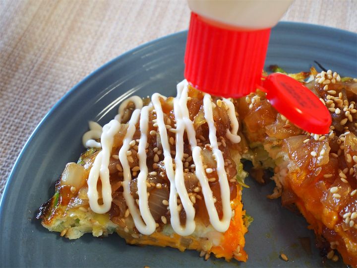 ばばさんが、玉ねぎソースの煮詰めが足らず味が薄かったからとマヨネーズをプラスしていたので真似っこ。全体がまろやかな味わいになって甘みが増します。少しお好み焼きっぽいかも⁉︎