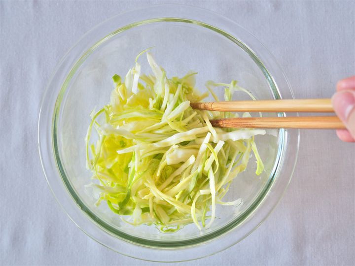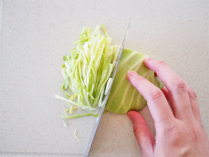 2.  キャベツを千切りにする。