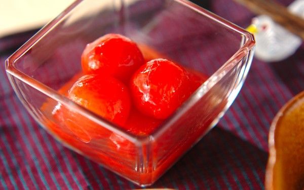 トマトをデザート感覚で食べられる一品。湯むきしたプチトマトをレモン汁とハチミツに漬けておくだけでOKです。冷蔵庫にひと晩置いておくと、より味がなじんでおいしいですよ。爽やかな甘みがたまりません。