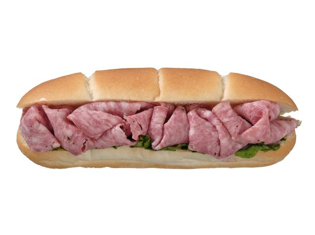 ソフトサラミとゴーダチーズソース、リーフレタスが盛り付けられたロールです。見た目にもワクワク。