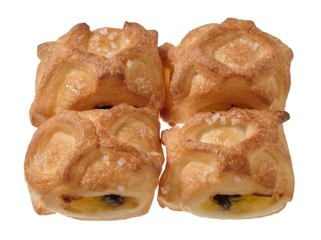 マーガリンを折り込んだ歯切れのよい食感のデニッシュに、レーズンとカスタードクリームの味わいを楽しめるパン4個入りの商品です。食事はもちろん、おやつとしてもぴったり。