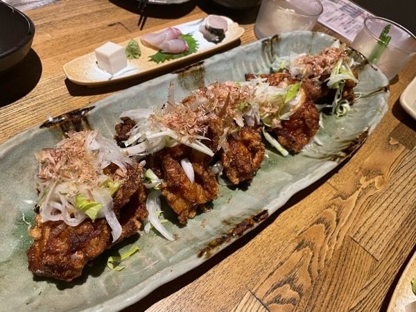 一つのサイズが大きく、揚げたて熱々。新玉ねぎが良いアクセントで、多めにかかってる鰹節と食べるとさっぱりいただけます。