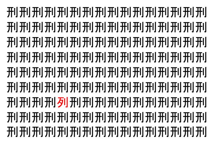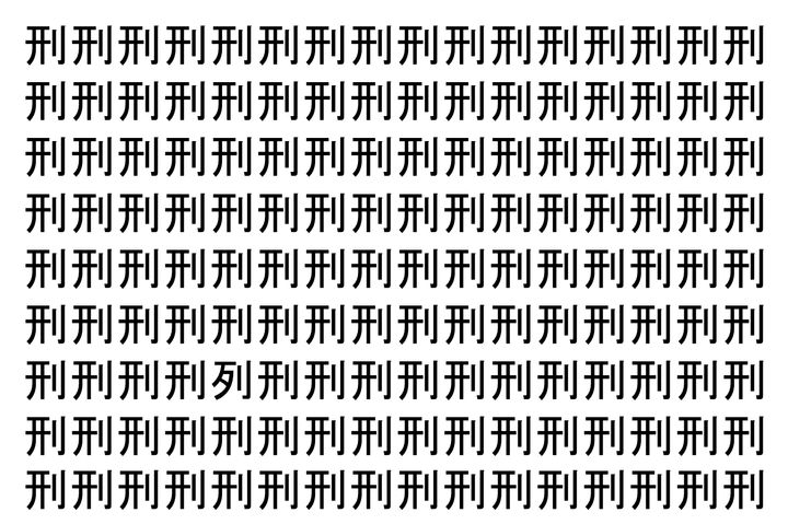 画像の中には、「刑」という漢字が縦に9行、横に16個並んでいます。 全部で144個となりますが・・・、そのうち1つは「異なる漢字」となってますよ!!