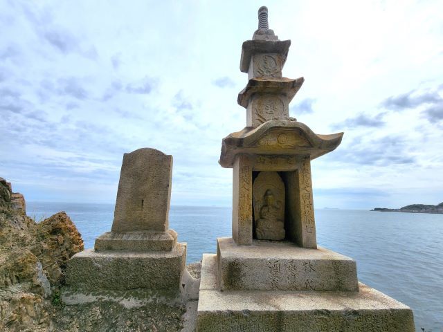 観音堂から続く遊歩道の突き当りには、「足摺さん」と呼ばれる石塔が建っていて、この場所も絶景です。そよぐ海風が心地よく、神秘的な雰囲気に包まれていますので、ぜひこちらにも足を運んでみてください。この場所から見える観音堂も美しいです。