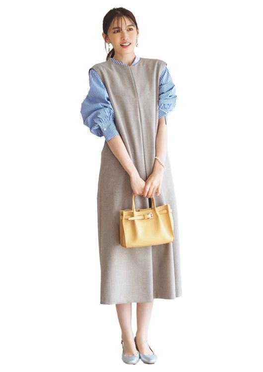 ブラウス付きワンピース(ワンピース)¥19,910/ミラ オーウェン ルミネ新宿2店 ストライプブラウス¥8,990/PLST シルバーパンプス¥17,600/Stola. イエローバッグ¥11,000/アンタイトル ブレスレット¥10,290、ボールイヤリング¥4,860/ともにアビステ