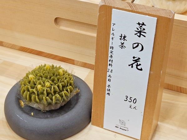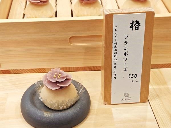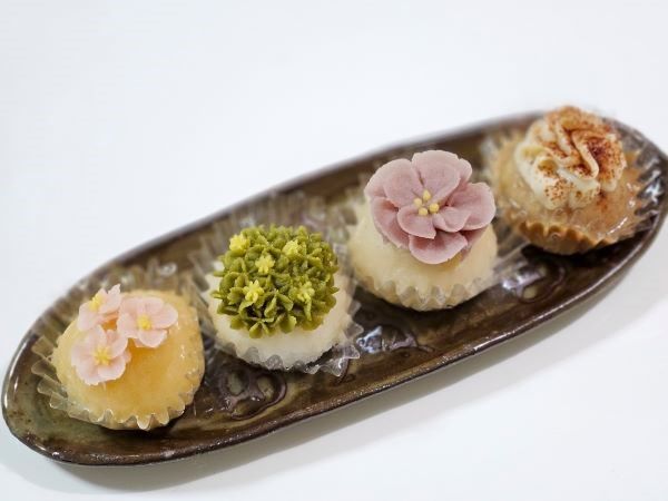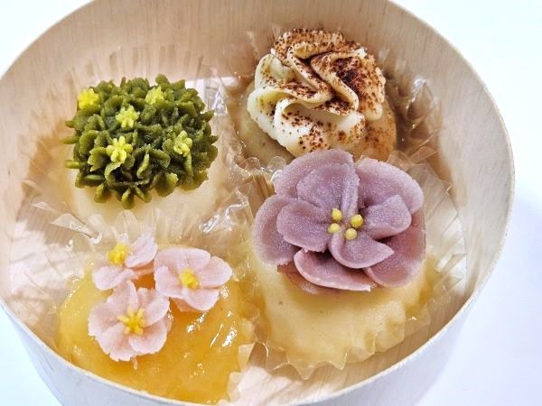 2月に販売していた「フラワーおはぎ」の中から、「梅の花」と「菜の花」、「椿」、バレンタインデーにちなんだ「恋ごころ(ティラミス)」を選びました。