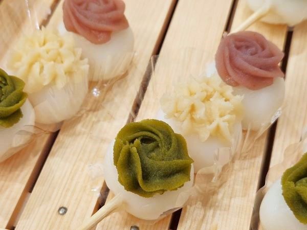 小花が飾られた「フラワー団子」もあります。(1本300円~)