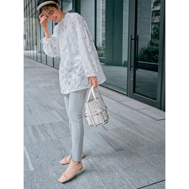 グレーパンツ¥19,800(yori)ブラウス¥33,000(ユナイテッドアローズ/ユナイテッドアローズ 六本木ヒルズ店)白バッグ¥61,600(オルセット/オルサ)シューズ¥34,100(チェンバー/ユナイテッドアローズ 丸の内店)カチューシャ¥26,400(アレクサンドル ドゥ パリ/アレクサンドル ドゥ パリ GINZA SIX店)ピアス¥27,500(リューク)