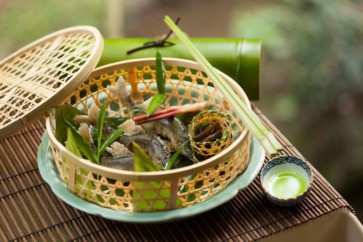 川床京会席ランチコース「涼風鈴音」で、鮎の汐焼きや鱧しゃぶなど、旬の素材を生かした京会席が楽しめます。
