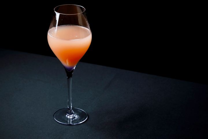 白桃とシャンパーニュで仕立てたカクテル「白桃のベリーニ」。白桃半個分の果肉にパッションフルーツのリキュールをほんの少し加え、さわやかな果実味があふれる一杯に仕上げました。