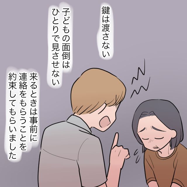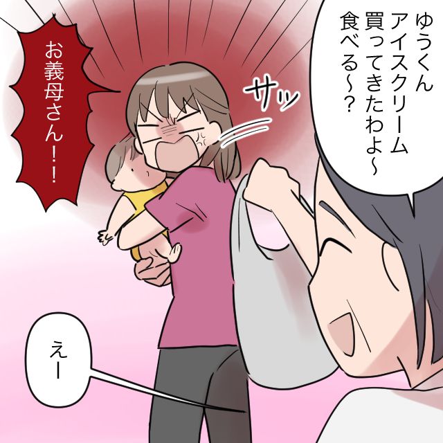 「ゆうに何かあったらどうするつもりだったんですか?お義母さん、責任取れるんですか!?」とユリさんが詰め寄ると、「もう~気にしすぎよ~」と適当に受け流す義母・・その言葉にブチッ!とキレたユリさんは、「お義母さんにはゆうを会わせたくありません!勝手に家に来ないでください!」そう言うと、ゆうくんを抱きかかえて部屋を出て行ってしまい・・