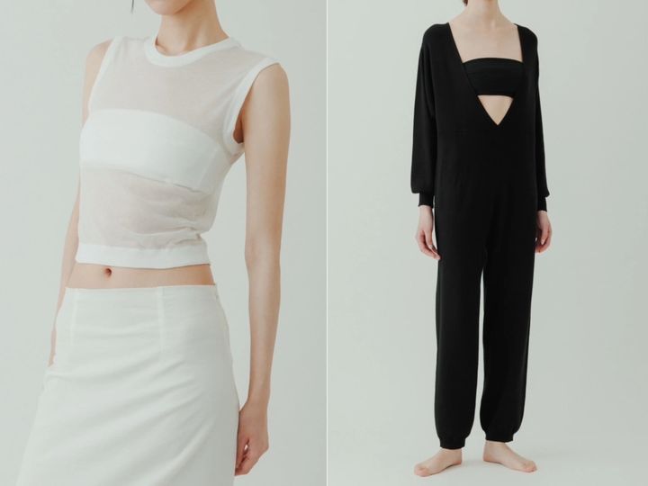 着用するとこんな感じ。透け感のあるトップス、胸元やお腹を見せたいコーディネートに大活躍しそう。タイニーブラ 各¥11,000(共にヨー ビオトープ)