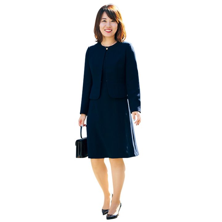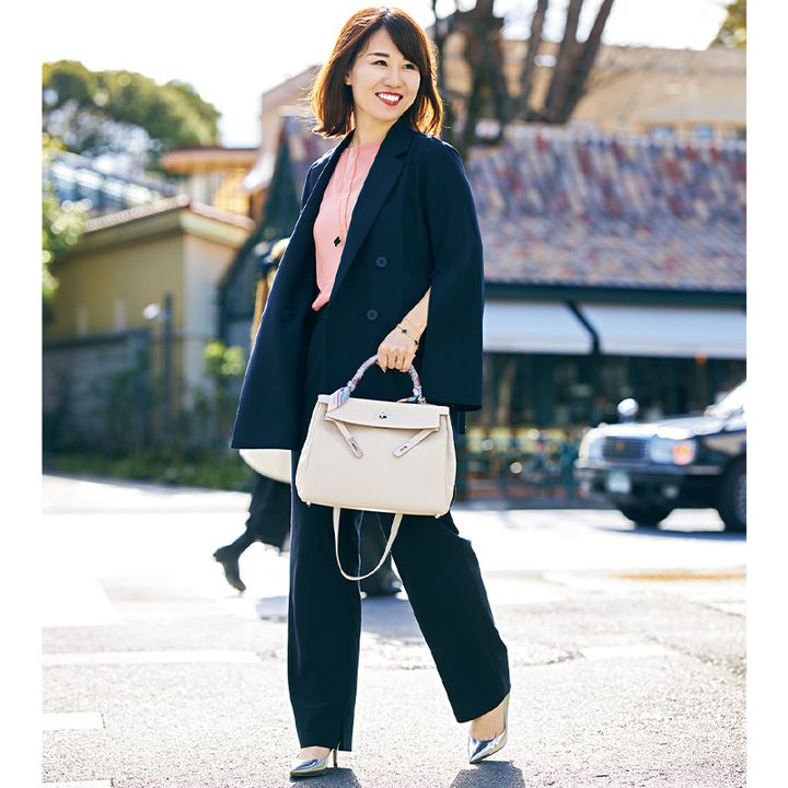 お迎え前にランチをすることも増えたため、そのままお店に入っても仰々しく見えないネイビーコーデを心がけています。崩しすぎても悪目立ちしてしまうので、シルエットとインナーで遊び心を示すくらいが丁度いいんです。