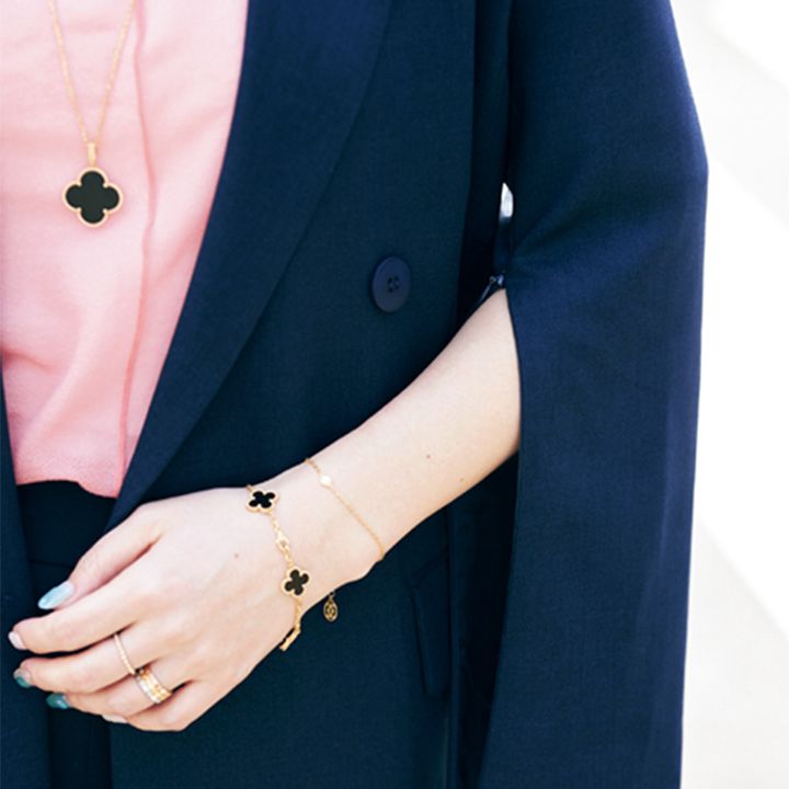 スリット入りのジャケットでお気に入りのジュエリーをちらりと覗かせて。ヴァンクリが大好きで少しずつ集めています。