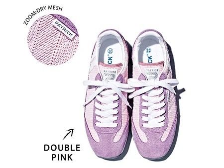 スニーカー 17,050円/パトリック(カメイ・プロアクト) ベロア×メッシュの素材MIXで、深みと清潔感を1足で両立。底にほどよい厚みもあり、ボトムの色に悩まず合わせられる濃淡をつけた渋みのあるピンク。