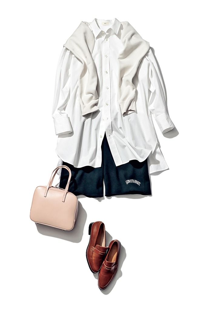 ビッグシャツのボリュームでハーフパンツもバランスよく。すそのボタンを2つ開けて、シャツのすき間からウエストラインをアピール。視覚的に腰位置を上げることで、必然的に脚長効果も。