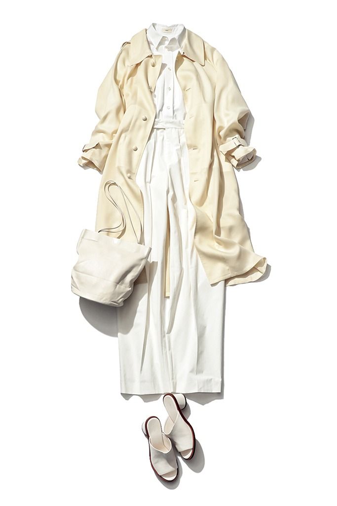 上下白は上下の丈感、シルエットに差をつけることでメリハリをつけて。キレイな色を合わせるなら、クリームイエローなど、白が混じったような、マイルドな色味を選ぶのが正解。白だけでなく、黒やネイビーなどの暗色と合わせてもコントラストが強すぎず、ベージュや白など淡い色も、色のトーンが近いことで考えなくてもバランスよくまとまる。