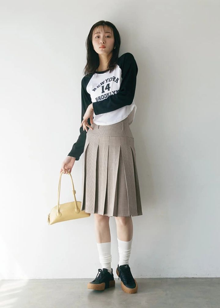 ラグランTは人気急上昇中のアイテム。スニーカーを取り入れつつ、チェック柄のスカートでお上品なギャップを添えて。