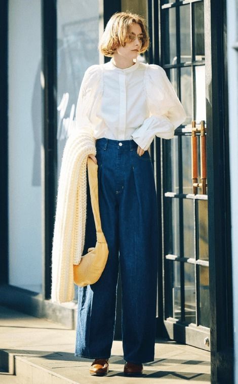 脚線も拾わず、腰位置も高く見えるウエストはキュッと締まった、ワイドシルエットのデニム。色褪せのない濃紺とヴィヴィッドカラーとのコントラスト、上は短く下は長い丈感のバランス、上はコンパクト・下はワイドのシルエットの対比でスタイル良く。