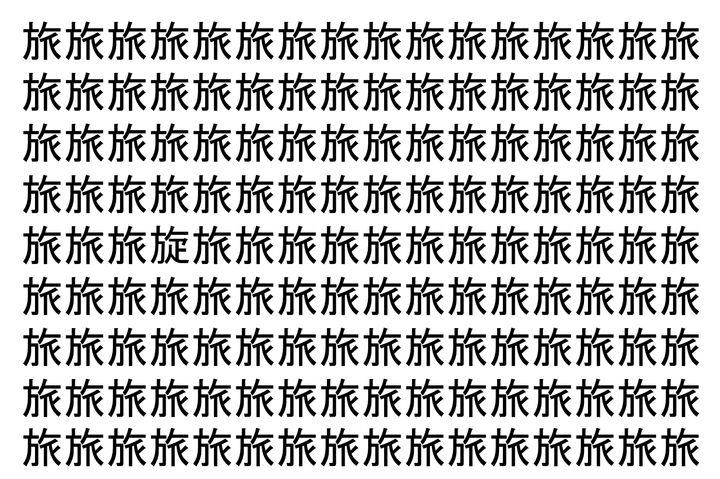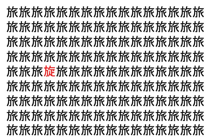 画像の中には、「旅」という漢字が縦に9行、横に16個並んでいます。 全部で144個となりますが・・・、そのうち1つは「異なる漢字」となってますよ!!