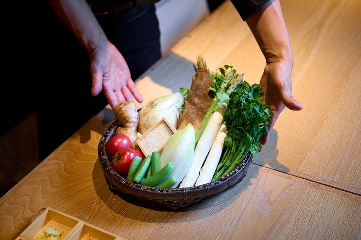 前菜の到着とともに、どんな野菜が使われているかを説明してもらえます。調理される前の野菜の姿を見ることで、より自然の恵みをありがたく感じながら食べられるというわけです。佐賀県のホワイトアスパラガス、菜の花、タケノコ、チコリ……。早速お品書きを見ながら味を確認しつつ、ひとつひとつを丁寧に食べていきましょう!