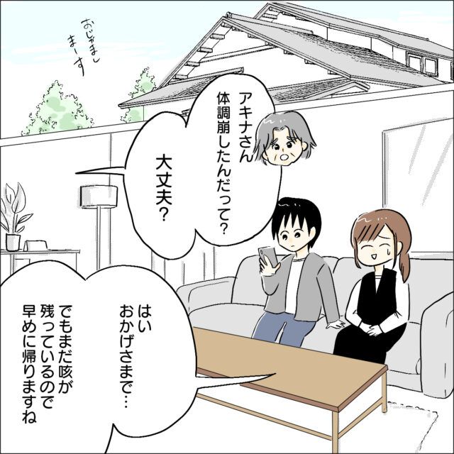 アキナさんの体調を心配する義母に笑顔で答えるアキナさん、その横では・・