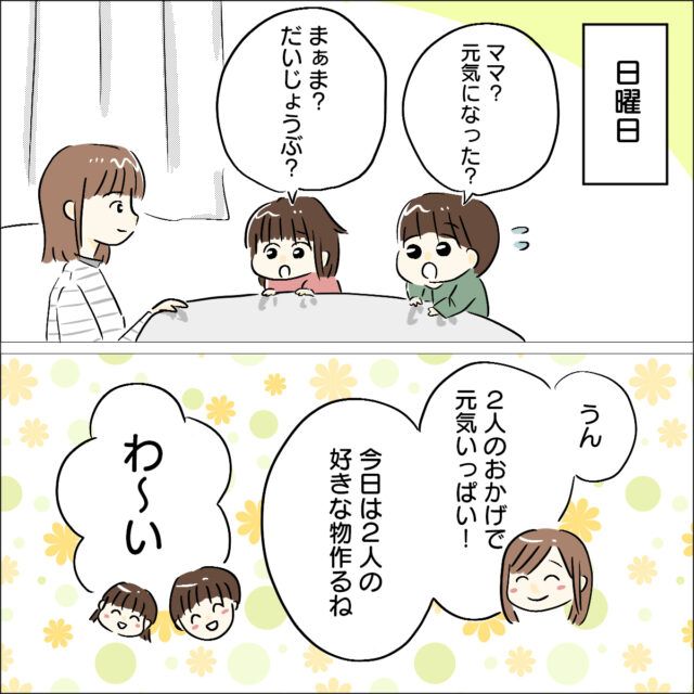 「うん。2人のおかげで元気いっぱい!今日は2人の好きなもの作るね」