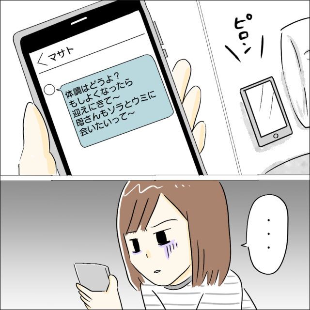 「体調はどうよ?もしよくなったら迎えに来て~。母さんもソラとウミに会いたいって~」