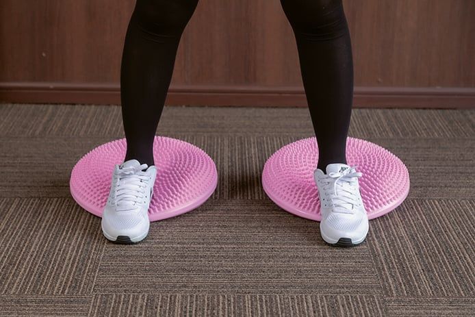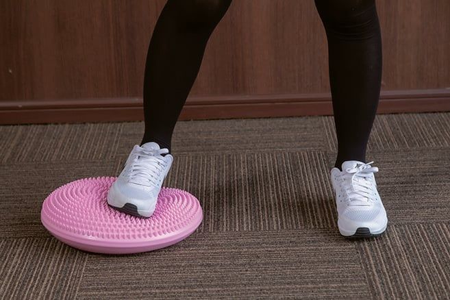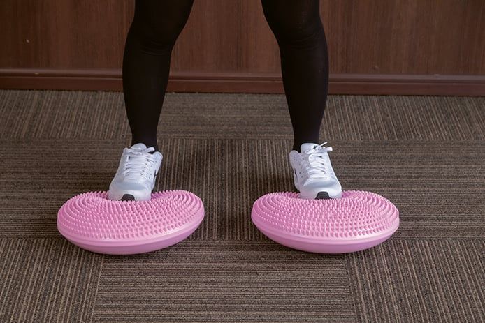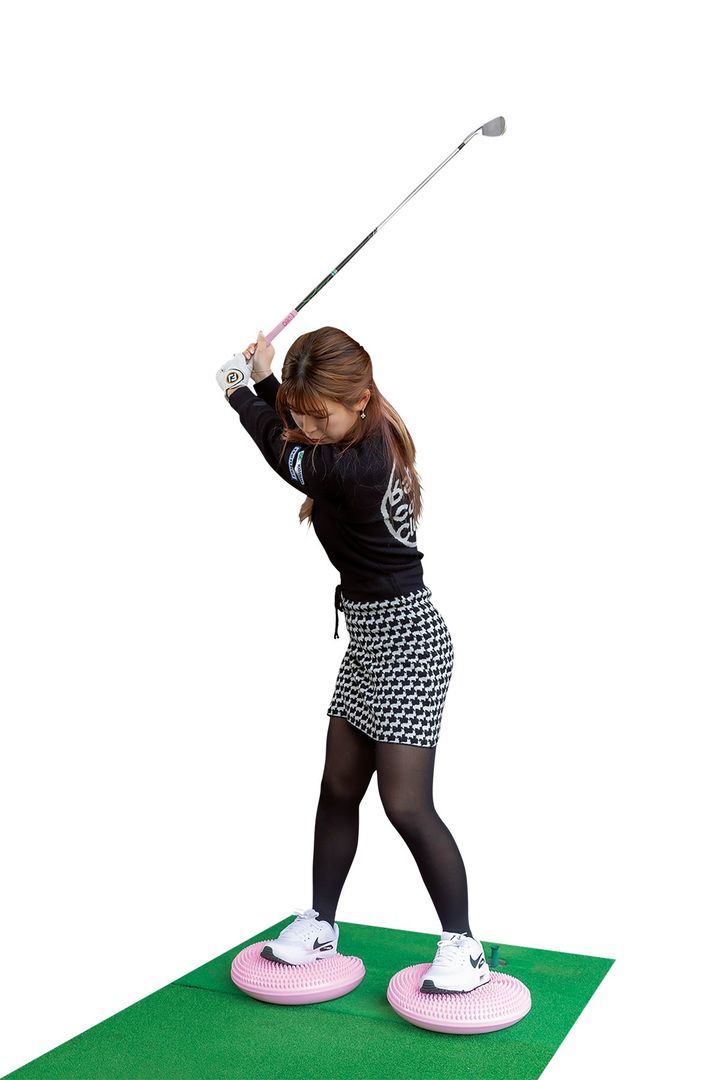 「上に乗ってハーフショットをするほか、ただ乗ってバランスを取るだけでも効果的。さらに、乗り方を変えるとさまざまなシチュエーションの練習が可能です」(中野)