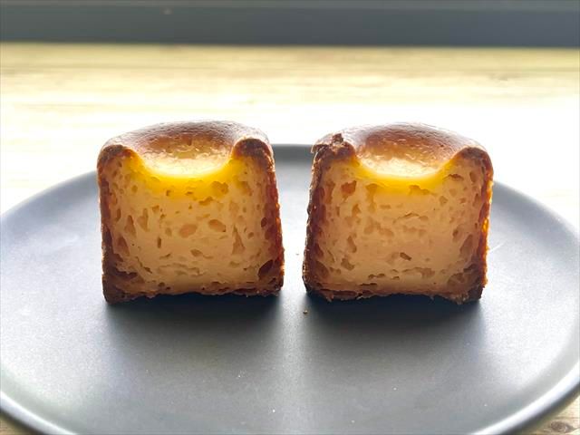少し小ぶりなカヌレの外側はカリカリ。まだほんのり温かみがあります。半分にカットすると、断面は普通のカヌレと同じで、しっとりとした生地感です。
