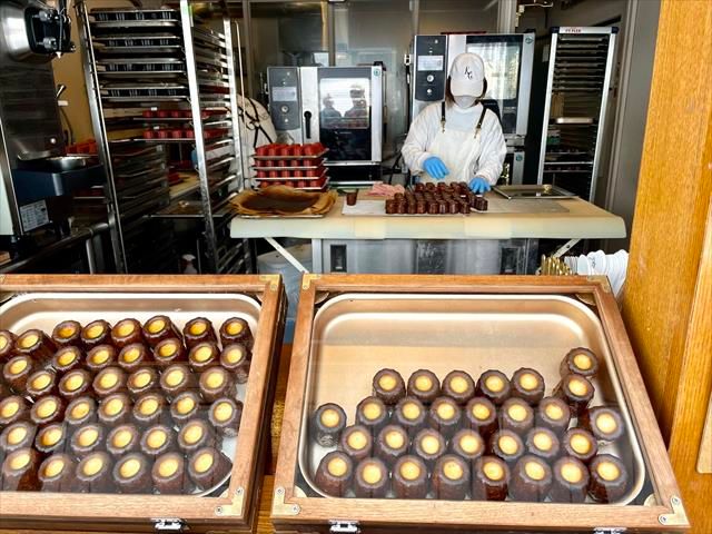 店頭には、ケースに入った焼きたてのカヌレが並びます。そしてお店には工房も併設。手作りでカヌレを焼き上げている様子がよく見えて、周りにはほのかに甘い香りが広がります! 食べる前から期待が膨らみますね。