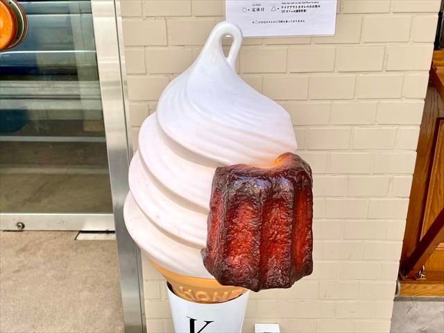 バニラのソフトクリームにカヌレをトッピングした、「カヌレ&ソフトクリーム」(税込650円)も人気です! おなじみのソフトクリームの看板にも、しっかりカヌレがのっていますね。