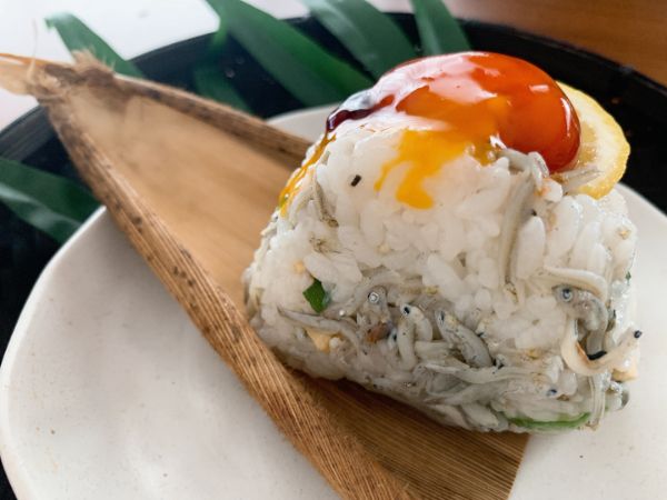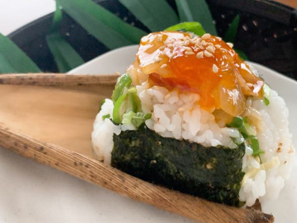 具材は、卵黄の愛媛産さしみ醤油漬けでお刺身を和えたもの。ゴマと薬味を混ぜ込んだ冷やご飯で握り海苔で巻く。