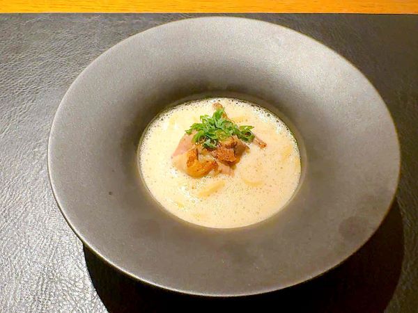 筍と蛍烏賊の焼きリゾット 焼きリゾットは、中華のおこげに似ていて食感が楽しいです!兵庫県養父市の蛇紋岩米を使っているそうです。和風の出汁をかけると、鮮やかなグリーンのニラのオイルが浮いてきて、とても美しいです。春のおいしさを詰め込んだ一皿です。