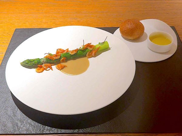 グリーのアスパラに色鮮やかな桜エビが映え、とても美しいです。アンチョビ、レモン、白みそを使ったソースよく合います。ふわふわのフォカッチャもすごく好きです。