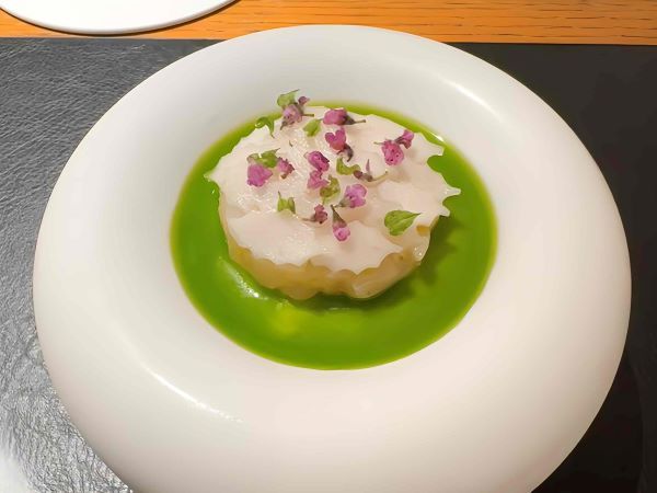 白色の蕪のマリネがお花のように綺麗です。ホタテの柔らかな味わいが魅力の冷製の一皿です。紫蘇の花とグリーンのソースもとても美しいです。 ノンアルのカクテルは、ジャスミン(バッションフルーツ+ジャスミンティー+ハチミツ)を一緒にいただき。スッキリ爽やかな甘さです。