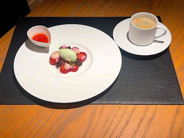 ヨーグルトとバジルアイスに苺のコンポート、苺のメレンゲ、カカオニブが添えられた華やかなデザートです。甘ずっぱい苺のソースをかけていただくと幸せなになります。
