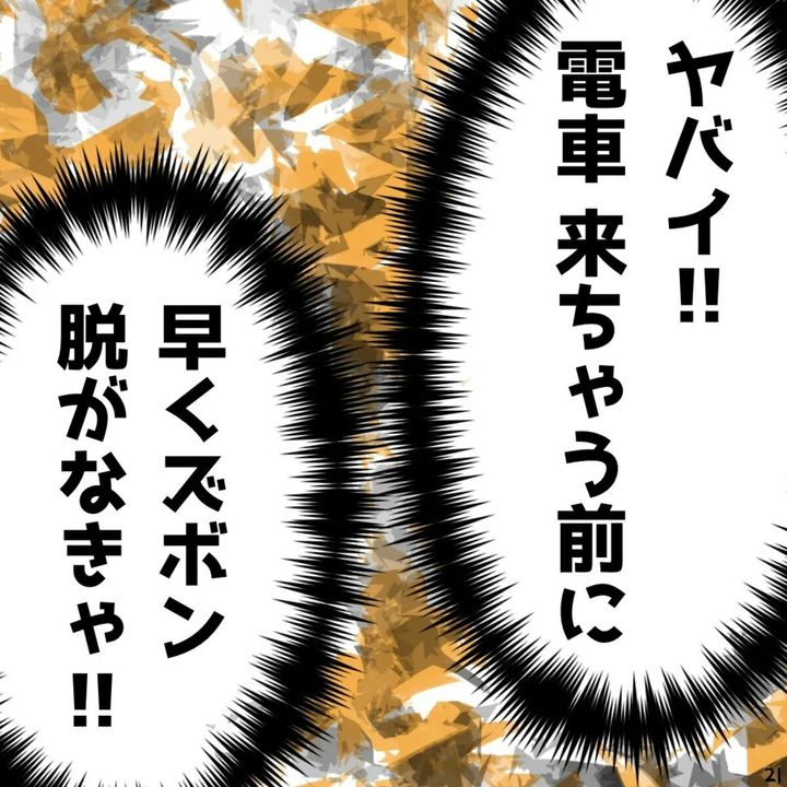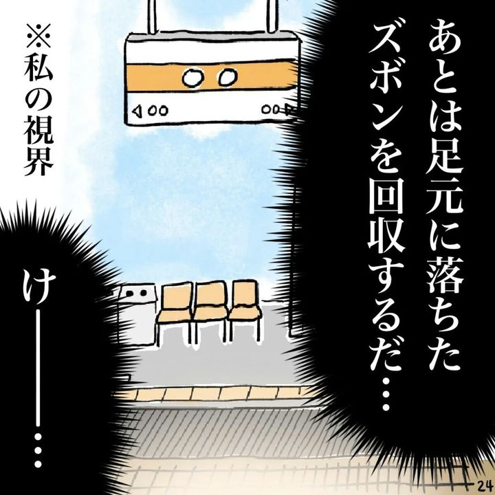 駅のホームでパンツ一丁になってしまった主人公。周囲にバレないようノールックでズボンを下ろしていたので、すぐに状況を飲み込むことができません。