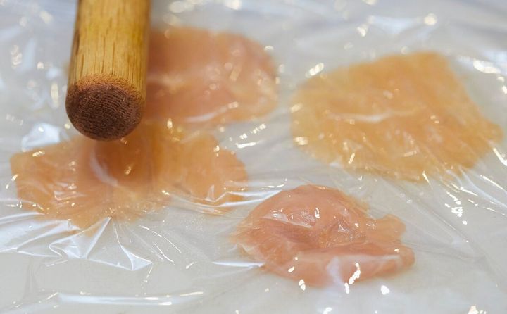 鶏胸肉は厚さ1〜2mmになるまでめん棒でたたくと、短時間で火を通すことができ、口当たりが柔らかになります。