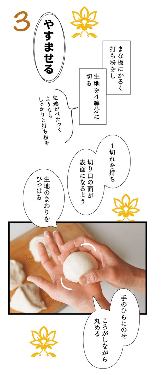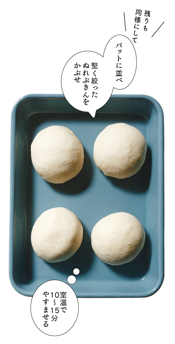 まな板にかるく打ち粉をし、生地を4等分に切る(生地がべたつくようならしっかりと打ち粉をする)。1切れを持ち、切り口の面が表面になるよう生地のまわりをひっぱる。手のひらにのせ、ころがしながら丸める。残りも同様にする。バットに並べ、堅く絞ったぬれぶきんをかぶせ、室温で10~15分やすませる。
